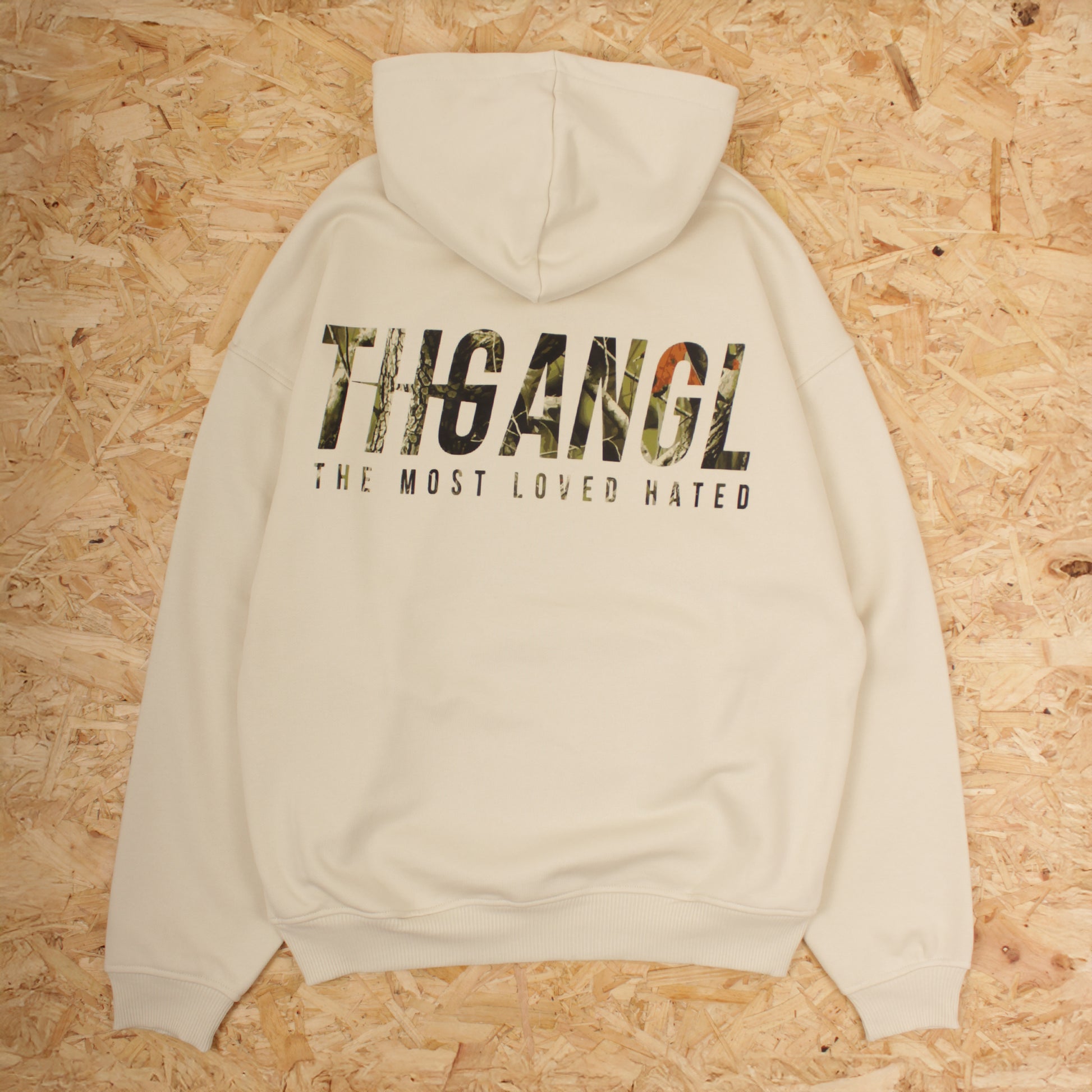 The Uniform Pullover Hoodie in Bone/Real Tree Camo. Engineered from substantial 440gsm cotton, this rare collectible (1 of 30) speaks volumes without compromise. Aggressive THGANGL branding across the chest and back signals your uncompromising stance. The fortified double-layer hood cuts an imposing silhouette while delivering unmatched durability. Crafted entirely from premium cotton, it's built to withstand the demands of those who live on their own terms. Claim your position in an exclusive circle of 30 who dare to stand apart.
